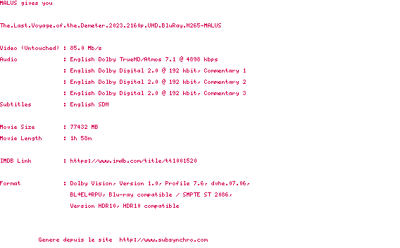 Voir le nfo de la release The.Last.Voyage.Of.The.Demeter.2023.2160p.UHD.BluRay.H265-MALUS