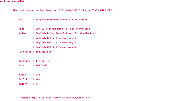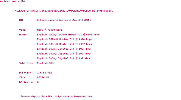 Voir le nfo de la release The.Last.Voyage.Of.The.Demeter.2023.2160p.UHD.BluRay.x265-B0MBARDiERS