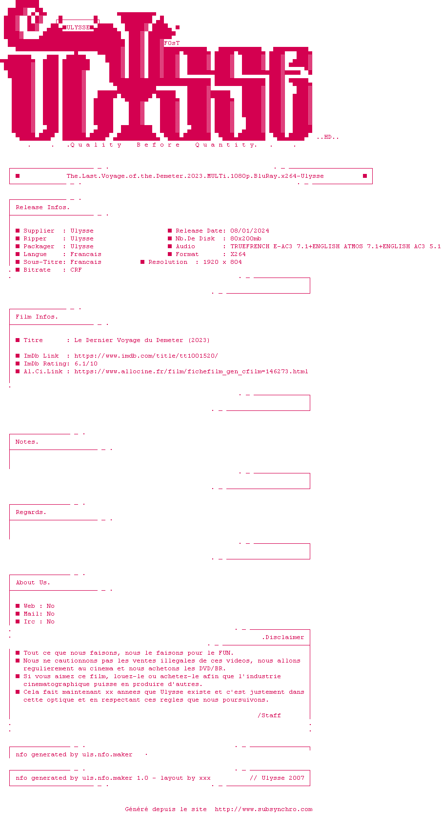 Voir le nfo de la release The.Last.Voyage.Of.The.Demeter.2023.MULTi.1080p.BluRay.x264-Ulysse
