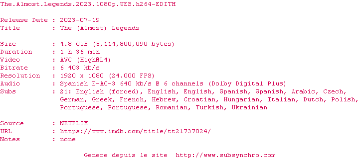 | Voir le nfo de la release The.Almost.Legends.2023.720p.WEB.H264-EDITH | EDITH | The.Almost.Legends.2023.720p.WEB.H264-EDITH OpenSubtitles | 0 fichier | ||