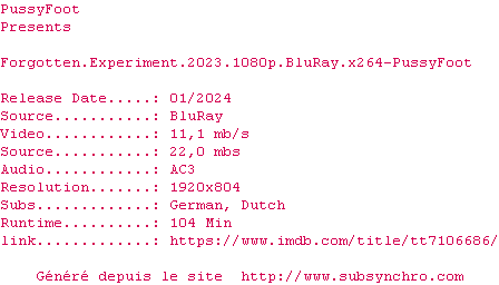 Voir le nfo de la release Forgotten.Experiment.2023.BDRip.x264-PussyFoot
