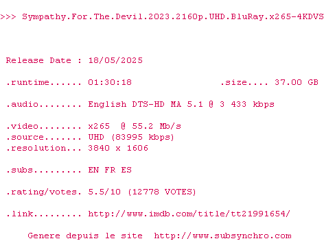 Voir le nfo de la release Sympathy.For.The.Devil.2023.COMPLETE.UHD.BLURAY-4KDVS