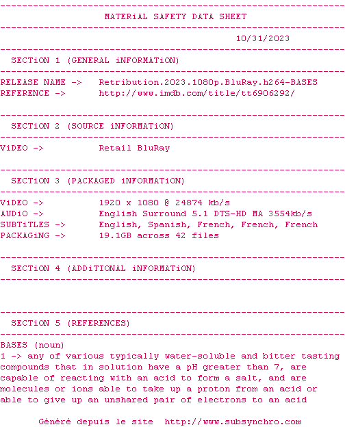 Voir le nfo de la release Retribution.2023.1080p.BluRay.H264-BASES