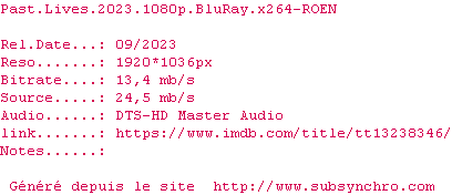 Voir le nfo de la release Past.Lives.2023.1080p.BluRay.x264-ROEN