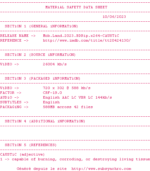 Voir le nfo de la release Mob.Land.2023.BDRip.x264-CAUSTiC