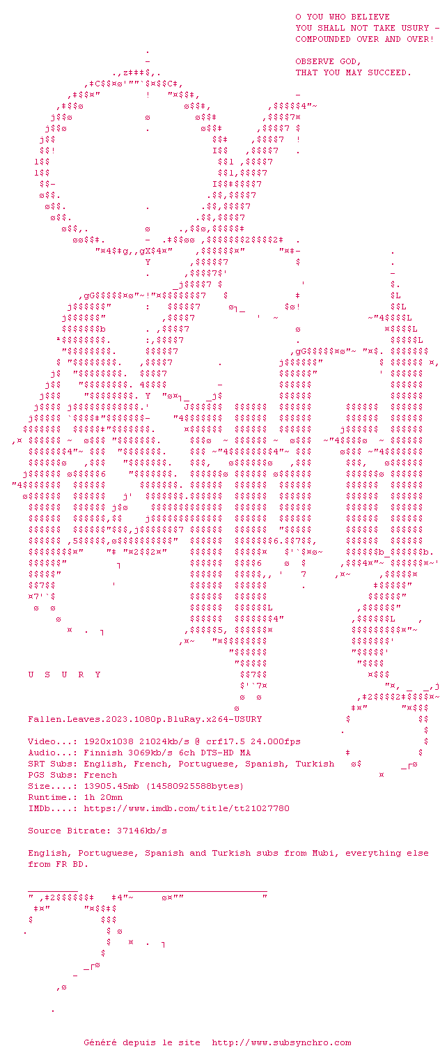 Voir le nfo de la release Fallen.Leaves.2023.1080p.BluRay.x264-USURY