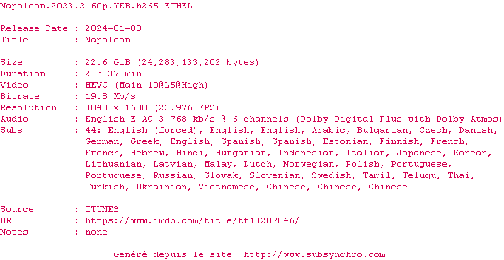 Voir le nfo de la release Napoleon.2023.MULTI.HDR.2160p.WEB.H265-LOST