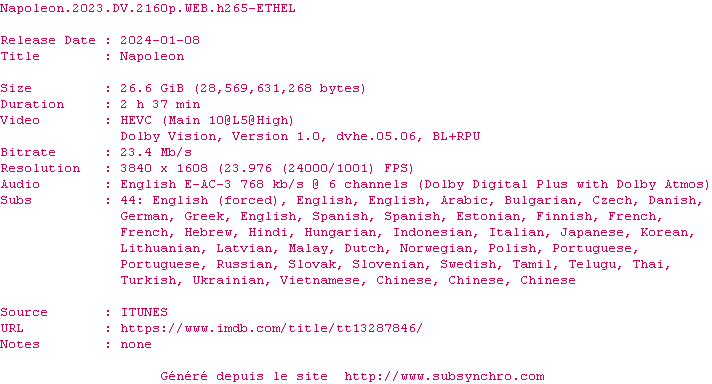 Voir le nfo de la release Napoleon.2023.DV.2160p.WEB.H265-ETHEL