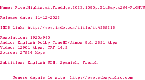 Voir le nfo de la release Five.Nights.At.Freddys.2023.1080p.BluRay.x264-PiGNUS
