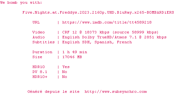 Voir le nfo de la release Five.Nights.At.Freddys.2023.2160p.UHD.BluRay.x265-B0MBARDiERS