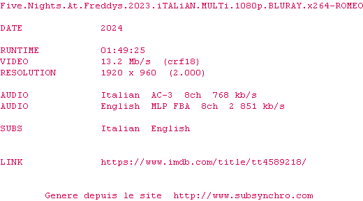 Y avez-vous pense ? Nous proposons déjà 1995 sous-titres pour le film Five Nights at Freddy's. Avez-vous essaye de voir si ces sous-titres etaient compatibles avec cette release ? On vous laisse le soin de tester cela pour nous et de contribuer au site en postant le sous-titre en cas de compatiblite constatee !