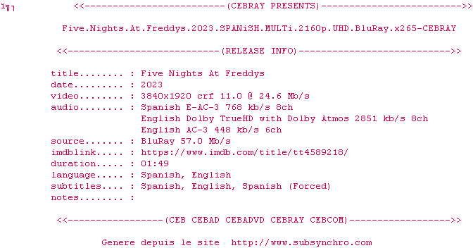 La release Five.Nights.At.Freddys.2023.SPANiSH.MULTi.2160p.UHD.BluRay.x265-CEBRAY est en 4K