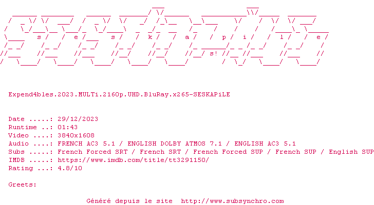 Le commentaire de SubSynchro Commente par SubSynchro (529), Le Mercredi 11 Octobre 2023 à 23h34 Ce soir, j'ai vu Expend4bles... Alors oui, c'est un chouette film d'action mais voir un film d'action se déroulant souvent la nuit (donc très sombre) et le visionner après 20h au cinéma, ça a rendu mon handicap de vision me fatiguant et a joué sur ma faculté à rester captivé... Le film est bien sur le principe mais c' était plus simple pour moi de voir Barbie au cinéma à 16h, la dernière fois ! Après psychologiquement, voir ce film m'a fait du bien moralement car je me suis senti jeune ! La premier volet est de 2010 et revoir Sylvester Stallone, Jason Statham ou Jet Li comme héros d'un film m'a ramené 15 ans en arrière où j'étais encore adolescent Le film était bien quoi qu'il en soit 8 / 10 0 0