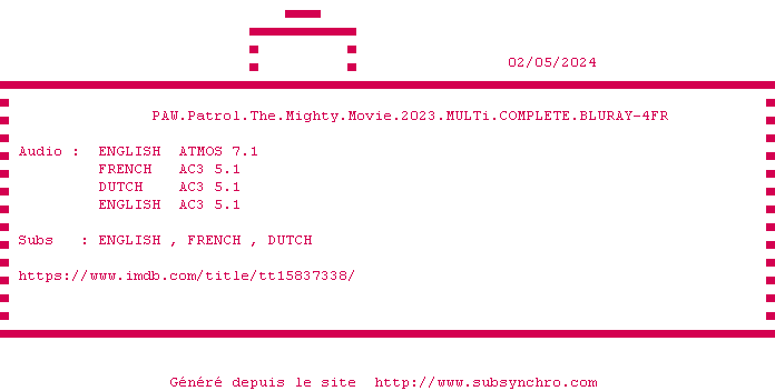 Voir le nfo de la release PAW.Patrol.The.Mighty.Movie.2023.MULTi.1080p.BluRay.x264-Ulysse