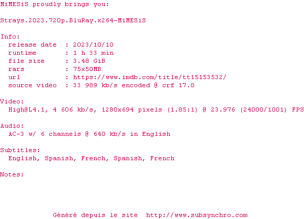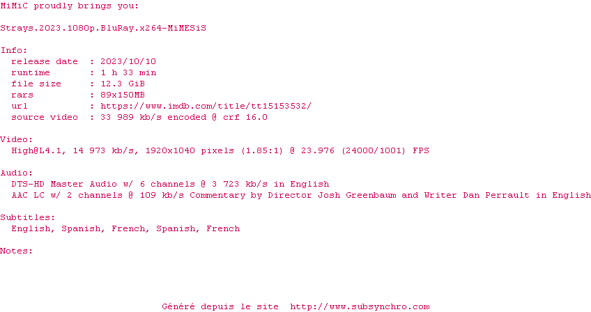 Voir le nfo de la release Strays.2023.1080p.BluRay.x264-MiMESiS