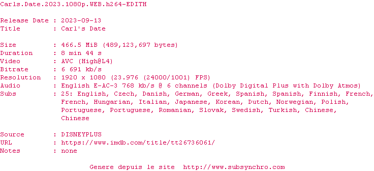 Voir le nfo de la release Carls.Date.2023.DV.2160p.WEB.H265-EDITH