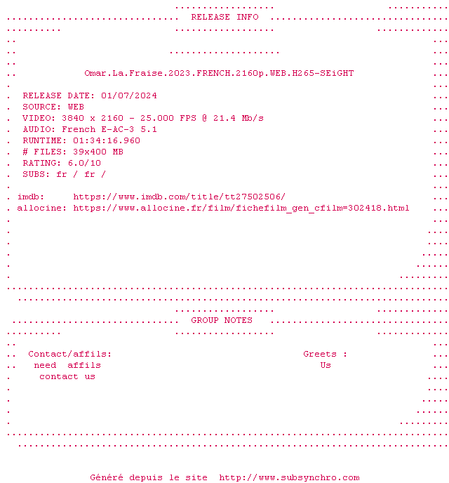 | Voir le nfo de la release Omar.La.Fraise.2023.FRENCH.2160p.WEB.H265-SEiGHT | SEiGHT | Omar.La.Fraise.2023.FRENCH.2160p.WEB.H265-SEiGHT OpenSubtitles La release Omar.La.Fraise.2023.FRENCH.2160p.WEB.H265-SEiGHT est en 4K | 0 fichier |