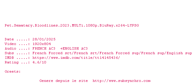 Voir le nfo de la release Pet.Sematary.Bloodlines.2023.MULTi.1080p.BluRay.x264-LYPSG