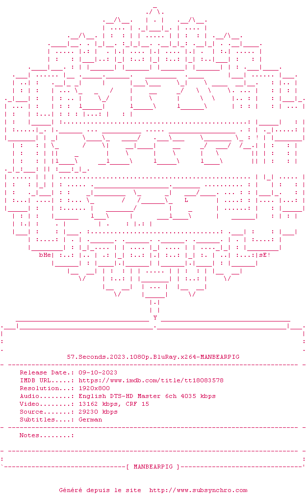 Voir le nfo de la release 57.Seconds.2023.1080p.BluRay.x264-MANBEARPIG