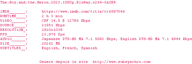 Voir le nfo de la release The.Boy.And.The.Heron.2023.1080p.BluRay.x264-GAZER