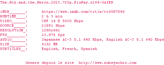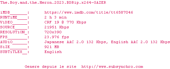 Voir le nfo de la release The.Boy.And.The.Heron.2023.720p.BluRay.x264-GAZER