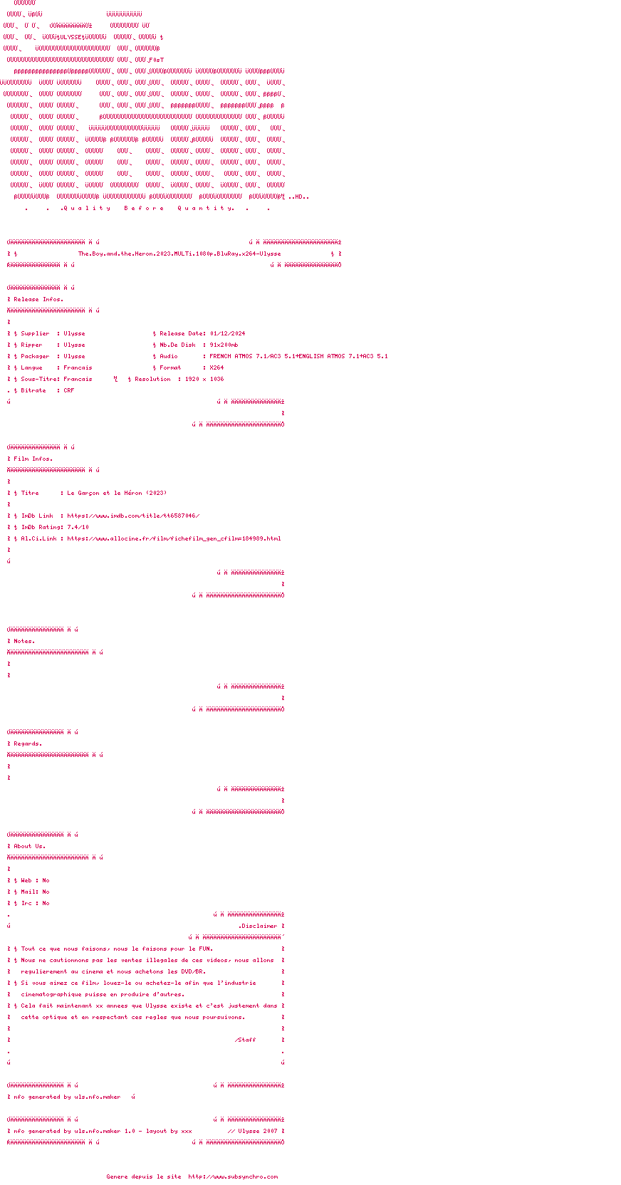 Voir le nfo de la release The.Boy.And.The.Heron.2023.MULTi.1080p.BluRay.x264-Ulysse