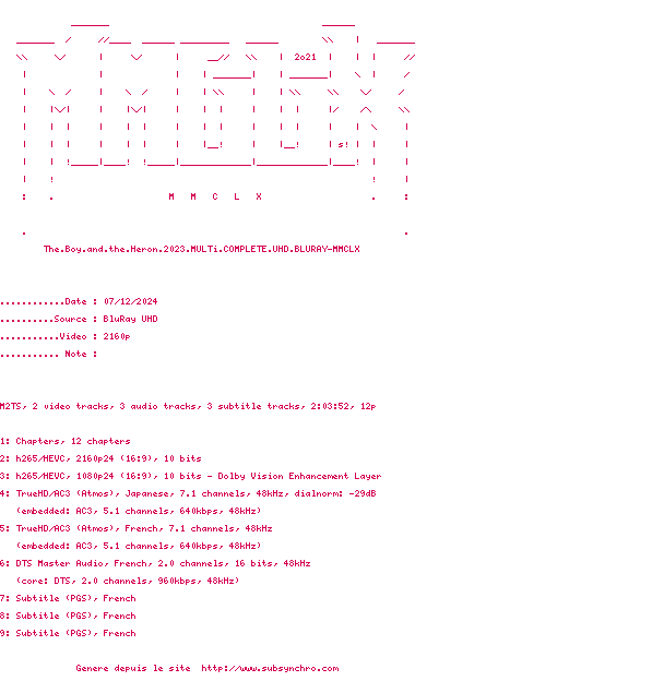 Voir le nfo de la release The.Boy.And.The.Heron.2023.MULTi.COMPLETE.UHD.BLURAY-MMCLX