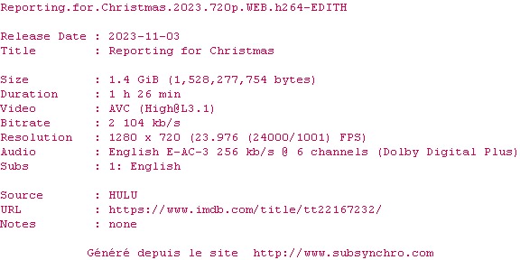 Voir le nfo de la release Reporting.For.Christmas.2023.720p.WEB.H264-EDITH