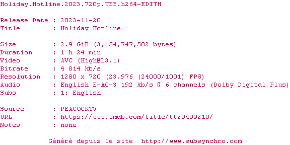| Voir le nfo de la release Holiday.Hotline.2023.1080p.WEB.H264-EDITH | EDITH | Holiday.Hotline.2023.1080p.WEB.H264-EDITH OpenSubtitles | 0 fichier | ||