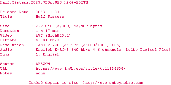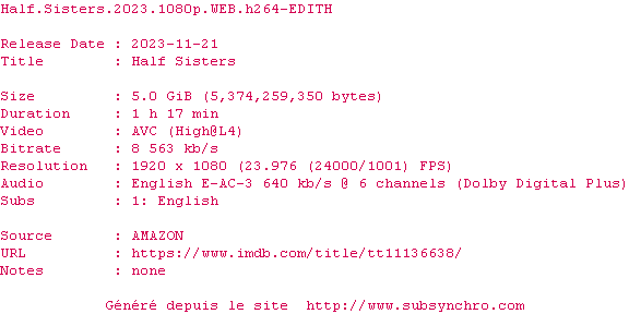 | Voir le nfo de la release Half.Sisters.2023.1080p.WEB.H264-EDITH | EDITH | Half.Sisters.2023.1080p.WEB.H264-EDITH OpenSubtitles | 0 fichier | ||