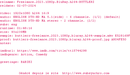 Voir le nfo de la release Freelance.2023.1080p.BluRay.H264-BUTTLERZ