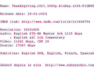 Voir le nfo de la release Thanksgiving.2023.1080p.BluRay.x264-PiGNUS
