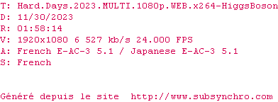 | Voir le nfo de la release Hard.Days.2023.MULTI.1080p.WEB.x264-HiggsBoson | HiggsBoson | Hard.Days.2023.MULTI.1080p.WEB.x264-HiggsBoson OpenSubtitles | 0 fichier |