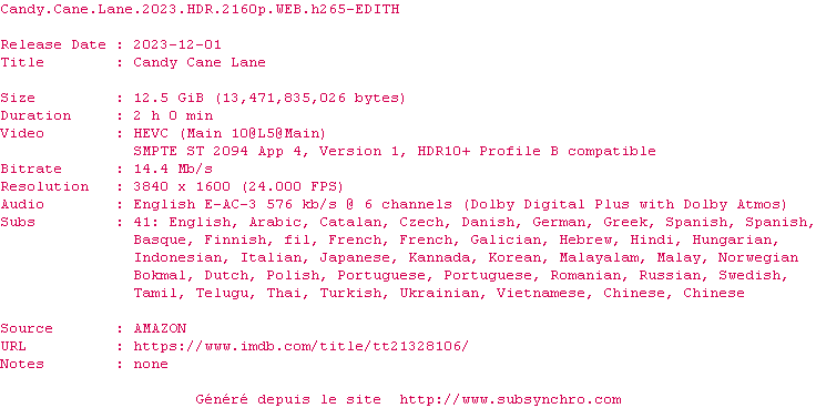 Voir le nfo de la release Candy.Cane.Lane.2023.HDR.2160p.WEB.H265-EDITH