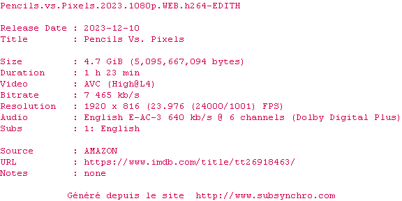 | Voir le nfo de la release Pencils.Vs.Pixels.2023.720p.WEB.H264-EDITH | EDITH | Pencils.Vs.Pixels.2023.720p.WEB.H264-EDITH OpenSubtitles | 0 fichier | ||