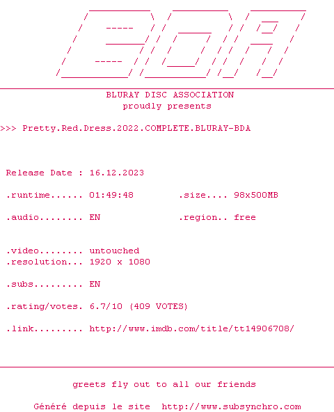 | Voir le nfo de la release Pretty.Red.Dress.2022.COMPLETE.BLURAY-BDA | BDA | Pretty.Red.Dress.2022.COMPLETE.BLURAY-BDA OpenSubtitles | 0 fichier | ||