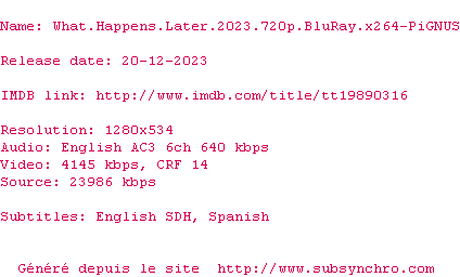 Voir le nfo de la release What.Happens.Later.2023.1080p.BluRay.x264-PiGNUS