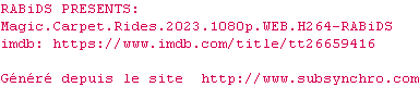 | Voir le nfo de la release Magic.Carpet.Rides.2023.1080p.WEB.H264-RABiDS | RABiDS | Magic.Carpet.Rides.2023.1080p.WEB.H264-RABiDS OpenSubtitles | 0 fichier | ||