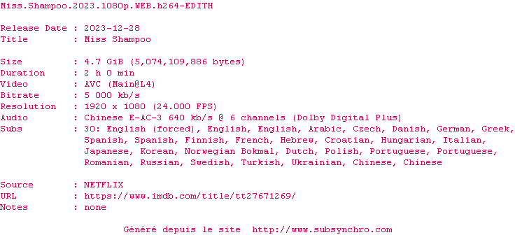 | Voir le nfo de la release Miss.Shampoo.2023.720p.WEB.H264-EDITH | EDITH | Miss.Shampoo.2023.720p.WEB.H264-EDITH OpenSubtitles | 0 fichier | ||