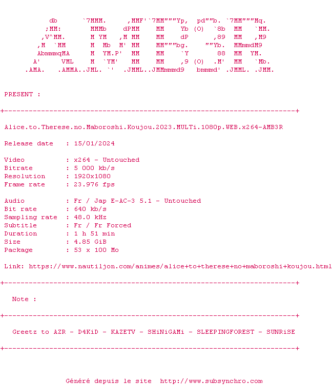 Voir le nfo de la release Alice.To.Therese.No.Maboroshi.Koujou.2023.MULTi.1080p.WEB.x264-AMB3R