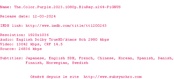Voir le nfo de la release The.Color.Purple.2023.1080p.BluRay.x264-PiGNUS