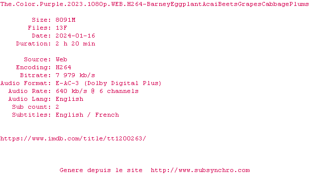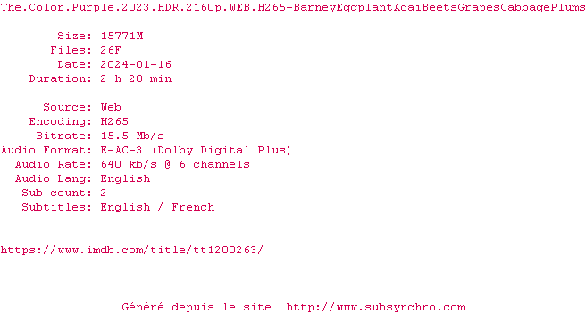 Voir le nfo de la release The.Color.Purple.2023.2160p.WEB.H265-BarneyEggplantAcaiBeetsGrapesCabbagePlums
