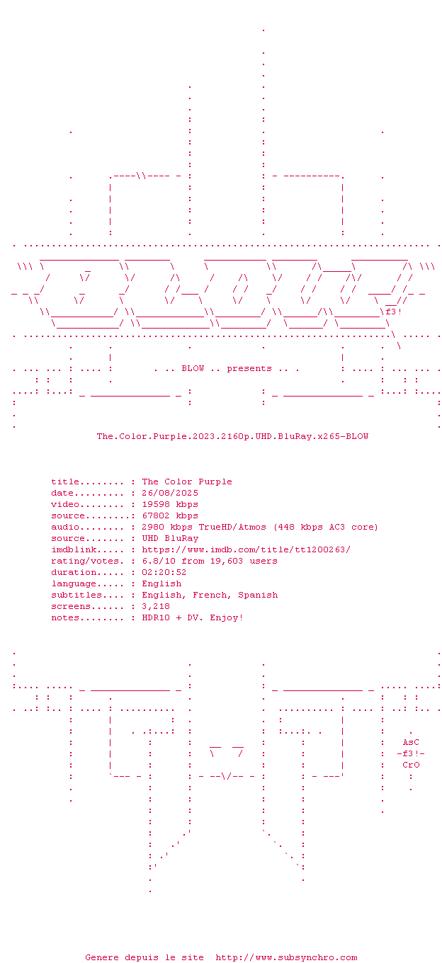 Voir le nfo de la release The.Color.Purple.2023.2160p.UHD.BluRay.x265-BLOW