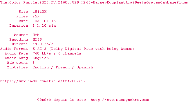 Voir le nfo de la release The.Color.Purple.2023.HDR.2160p.WEB.H265-BarneyEggplantAcaiBeetsGrapesCabbagePlums