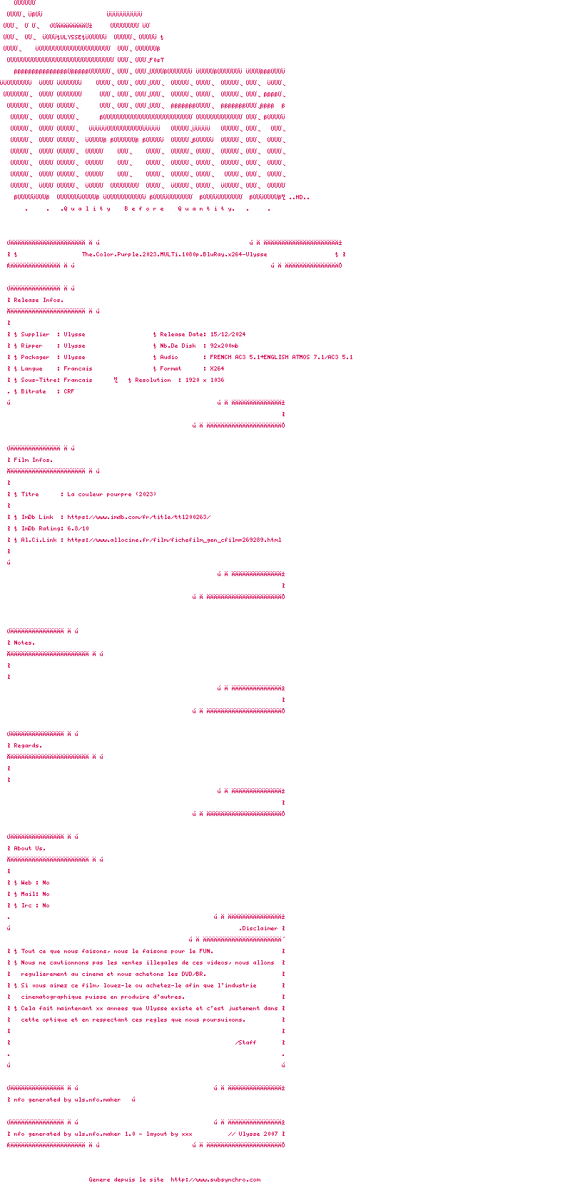 Voir le nfo de la release The.Color.Purple.2023.MULTi.1080p.BluRay.x264-Ulysse