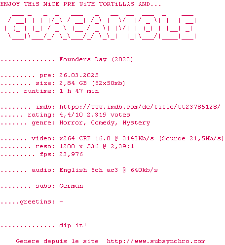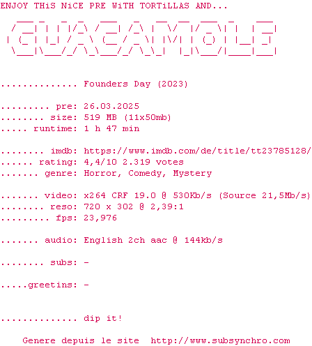 Voir le nfo de la release Founders.Day.2023.BDRiP.x264-GUACAMOLE