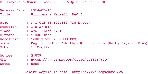 Voir le nfo de la release Williams.And.Mansell.Red.5.2023.720p.WEB.H264-EDITH