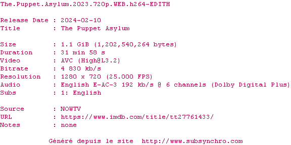 Voir le nfo de la release The.Puppet.Asylum.2023.720p.WEB.H264-EDITH