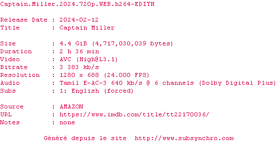 | Voir le nfo de la release Captain.Miller.2024.720p.WEB.H264-EDITH | EDITH | Captain.Miller.2024.720p.WEB.H264-EDITH OpenSubtitles | 0 fichier | ||