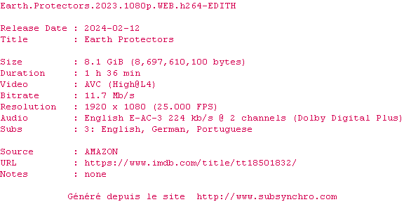 | Voir le nfo de la release Earth.Protectors.2023.720p.WEB.H264-EDITH | EDITH | Earth.Protectors.2023.720p.WEB.H264-EDITH OpenSubtitles | 0 fichier |